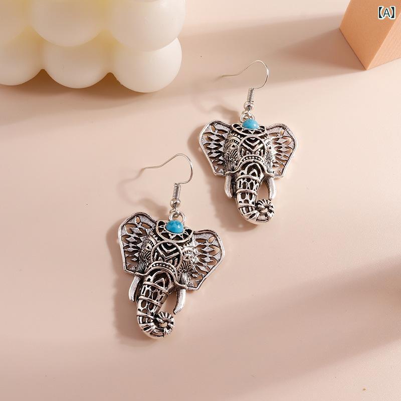 イヤーアクセサリー ユニセックス 欧米風 レトロ ヴィンテージ ボヘミアン スタイル アンティークシルバー エレファント ターコイズ 象モチーフ 縁起物 亜鉛合金製