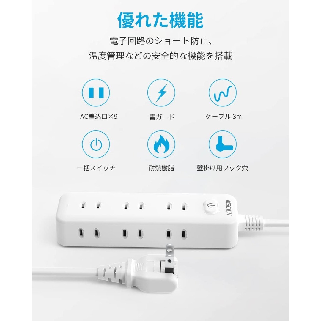 【サイズ:3M】Mscien 延長コード 3m 電源タップ 雷ガード 9個口 M