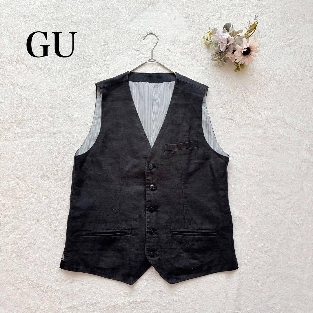 【ジーユー】ベスト(L)ジレ 麻混 シンプル メンズ 無地 黒 レイヤード