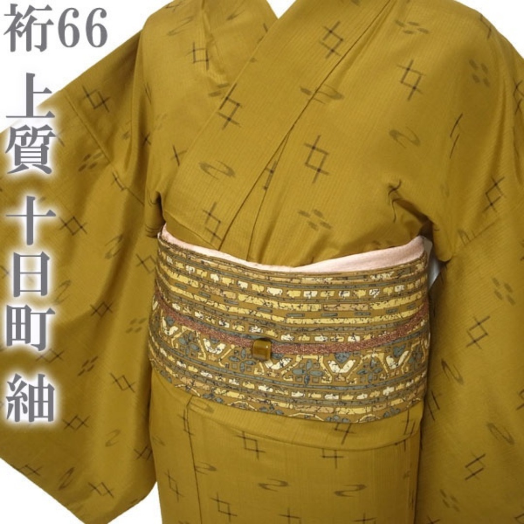 紬 着物 袷 十日町 和芥子色 黄色 絣 かすり 裄66 L 中古 sn1601