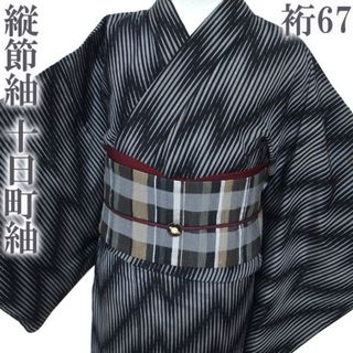 十日町紬 縦節紬 着物 袷 黒 ギザギザ...