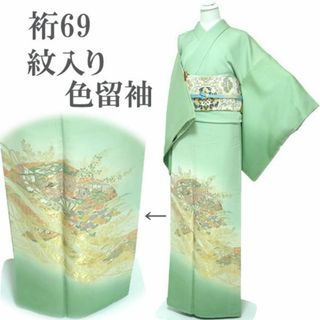 色留袖 着物 袷 織り柄 薄黄緑 源氏扇...