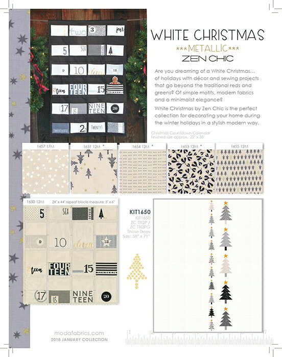 【Moda モダ】White Christmas Metallic-1650F8M(28枚) 約22.8cm * 約55cm ホワイト グレー ブラック ゴールド メタリック加工 クリスマス柄 文字柄 英字柄 植物柄 星柄 メタリック加工 プレカット カットクロス コットン100% シーチング