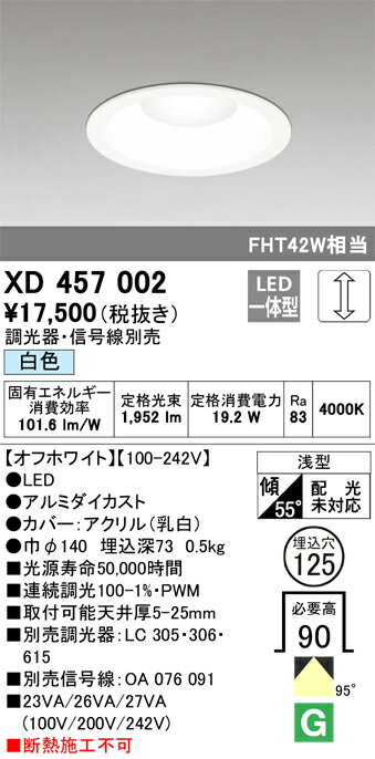 ODELIC LEDベースダウンライト FHT42W×1灯相当 オフホワイト 98° 埋込穴Φ125mm 白色 4000K M形 一般型 専用調光器対応 XD457002 (調光器・信号線別売)