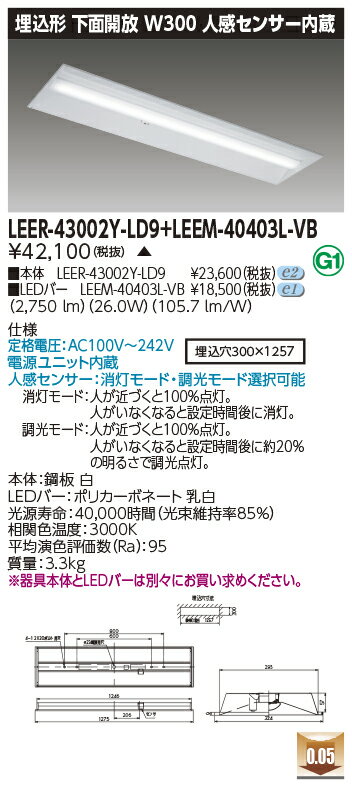 東芝 LEDベースライト 40タイプ 埋込形下面開放W300 人感センサー内蔵 高演色4,000lmタイプ FLR40形×2灯 省電力タイプ相当 電球色 AC100V〜242V LEDバー付 LEER43002YLD9+LEEM40403LVB ※受注生産品