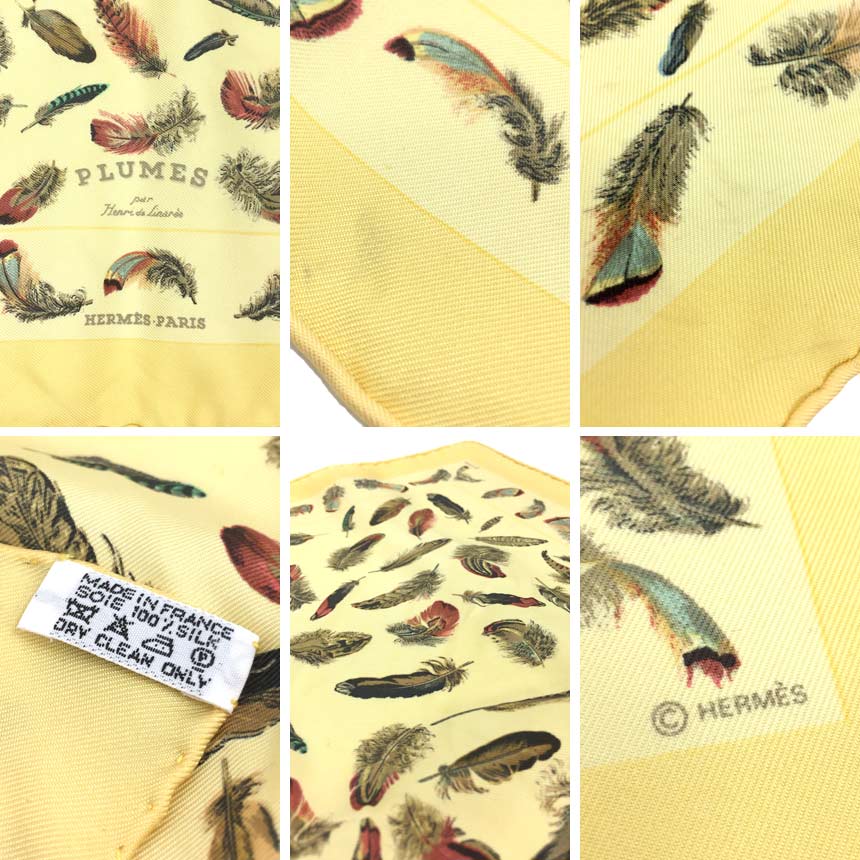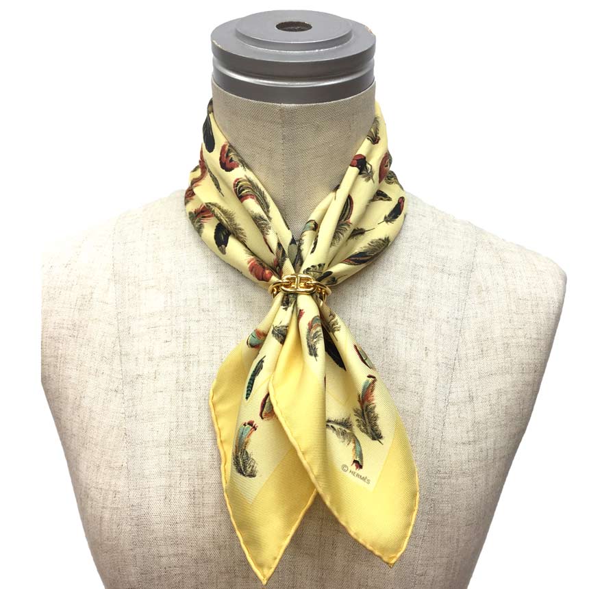 HERMES エルメス カレ45 スカーフ LES PLUMES 羽根 イエロー系 シルク100%【中古】aq11442