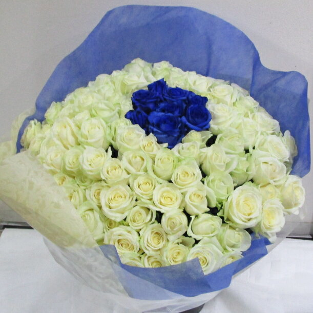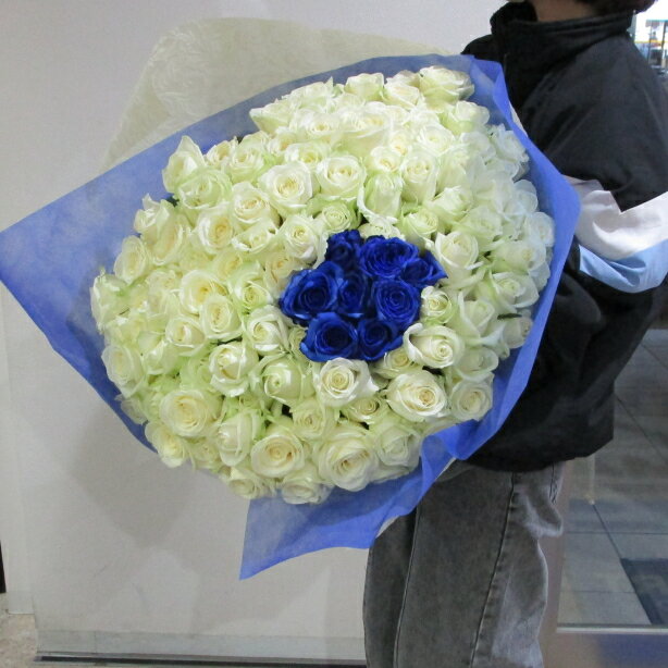 バラの花束/白バラとブルーローズ108本の花束 【プロポーズにおすすめ】ブルーローズ8本、白バラ100本