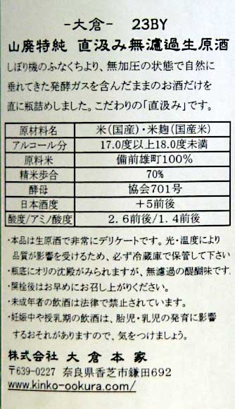 大倉 山廃特別純米備前雄町70%磨き無濾過生原酒1800ML大倉本家(奈良県香芝市)