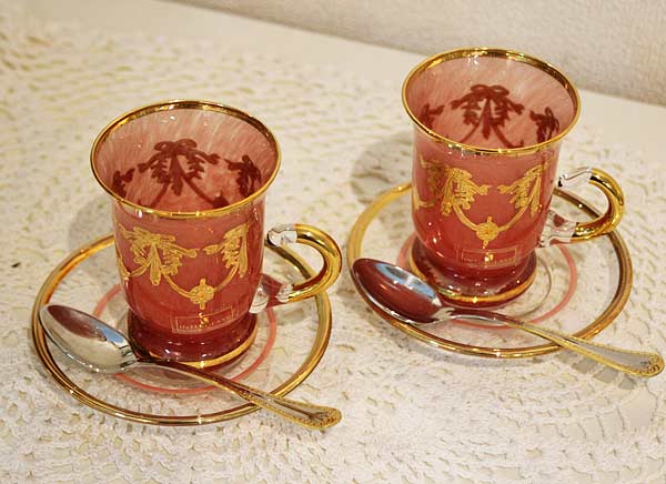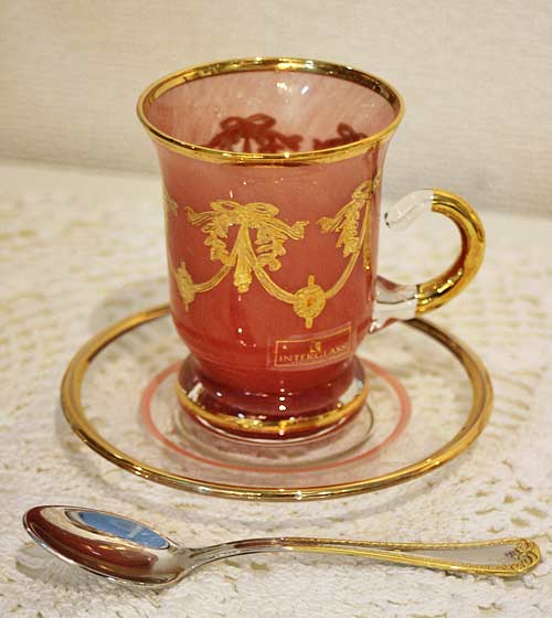 イタリア製 輸入雑貨 カップソーサー ペア ガラス ピンク 金 リビングスタジオ 直輸入 インターグラス Interglass 姫系 034PIN 対象地域送料無料