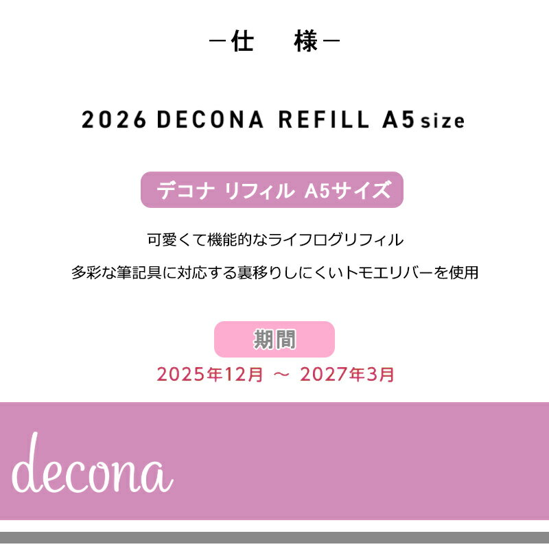 【11/1〜30ポイント5倍要エントリー】【2026年版】レイメイ藤井 デコナ decona日付入りリフィル A5 6穴 月間-1 HAR26001 34ページ/17枚 16ヶ月分 2025年12月〜2027年3月 見開き両面1ヶ月 ブロック式 1月/4月始まり両対応 手帳専用紙 女子に人気のかわいいシステム手帳