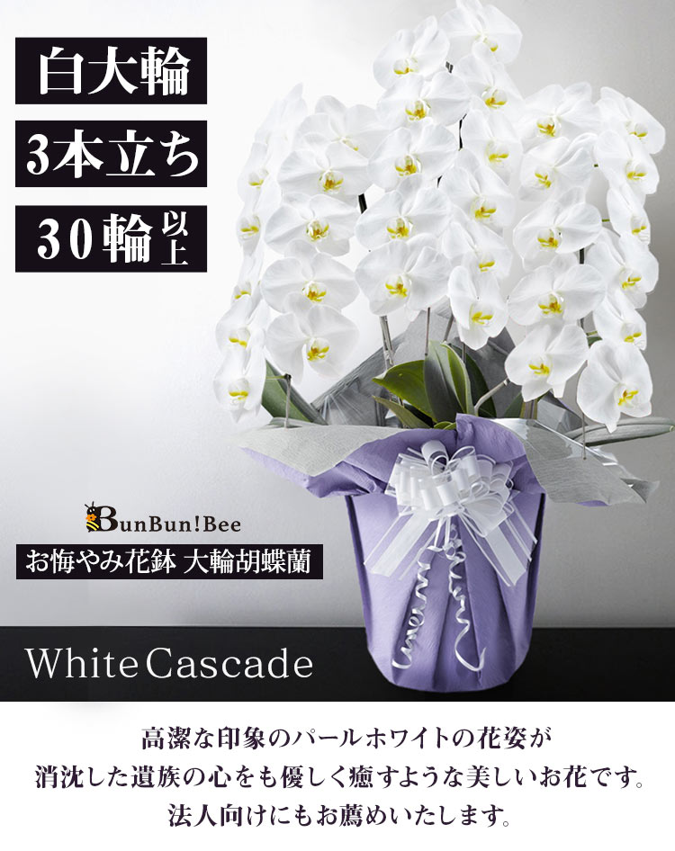 お悔やみ花鉢「大輪胡蝶蘭 プレミアム・白」 3本立ち 30輪以上(つぼみ込) 送料無料 コチョウラン お供え 花 お悔やみ 供花 花鉢 生花 仏花 フラワー ギフト お彼岸 お盆 法要 供養 初盆 命日 法事 お悔み 四十九日 ペット 枕花 仏事 弔事 喪中 見舞い