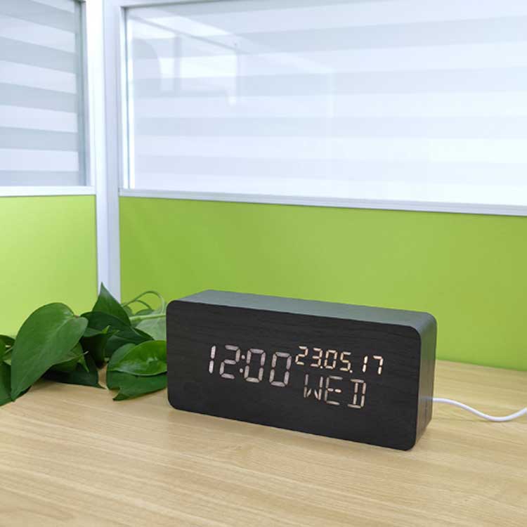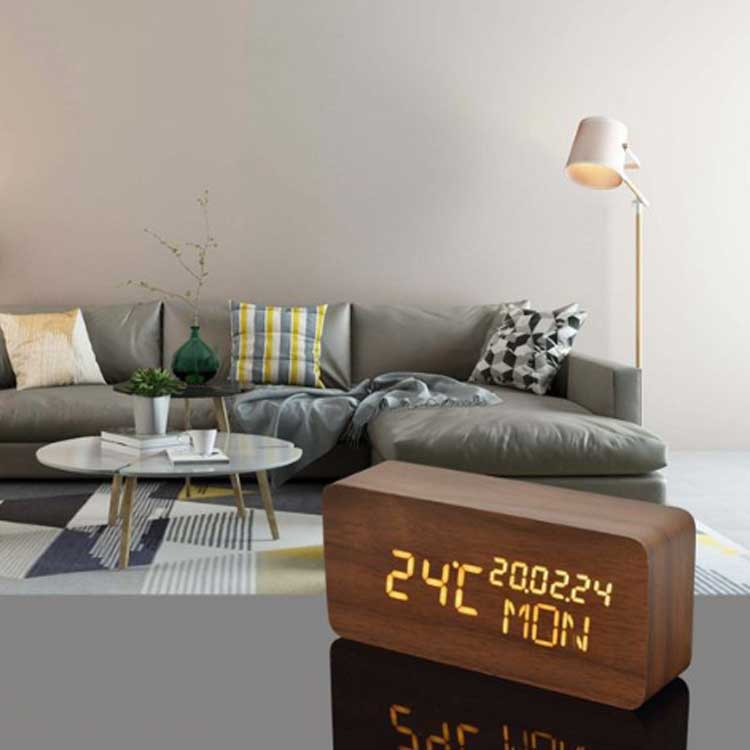 置時計 目覚まし時計 部屋に馴染み 置き時計 木製 充電式 アラーム USB給電 おしゃれ カレンダー デジタル時計 木目調 時計 温度計 LED表示 北欧 大音量 音感センサー 輝度調節 設定記憶 卓上 インテリア かわいい コンパクト 結婚祝い 子供