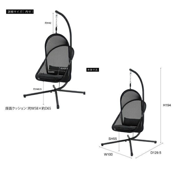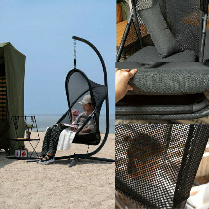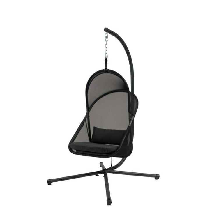東谷ハンギングチェア スチール 自立式 チェアー 椅子 折りたたみ式 アウトドア ルーフ付き 吊り下げ 日除け キャンプ ブラック リゾート ゆったり メッシュ