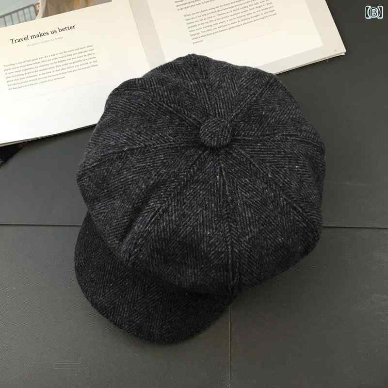 ベレー帽 キャスケット 男女兼用 韓国風 秋冬 レトロ ブリティッシュ ストライプ チェック柄 おしゃれ ウール調 フェルト 画家風 普段使い お出かけ コーデアイテム 黒 茶 カーキ
