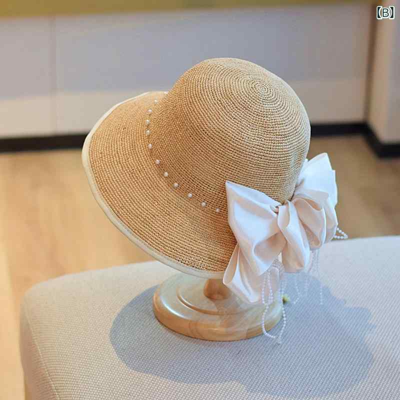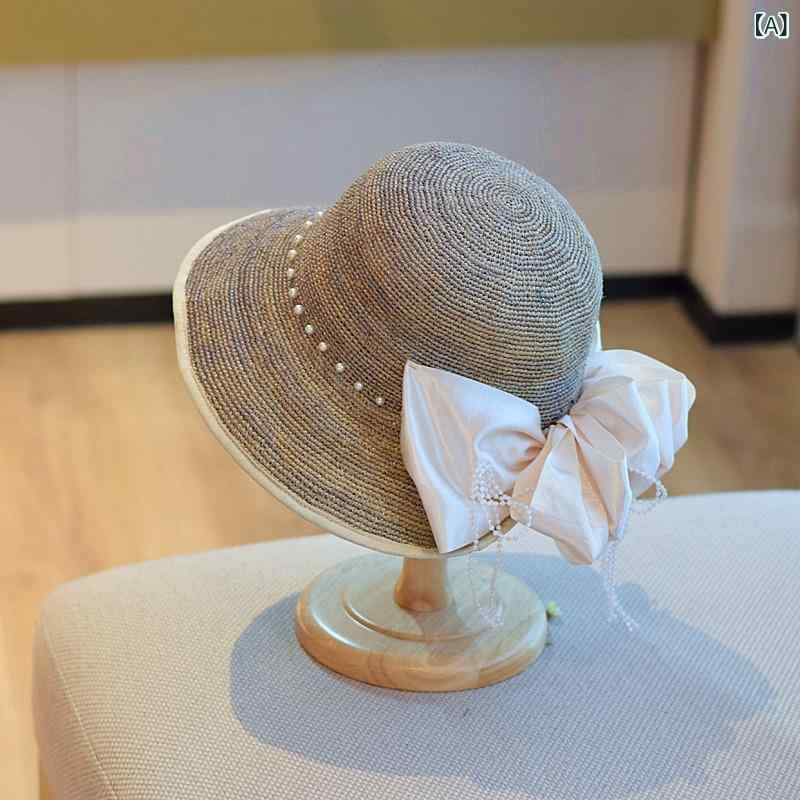 麦わら帽子 レディース ラフィア素材 フレンチシック 高級感 パール調サテン光沢 ギャザー 細編み つば広帽子 ラウンドフォルム 夏 リゾート 旅行 UVカット 日よけ ナチュラルスタイル