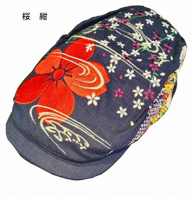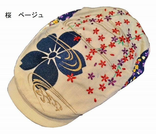 【送料無料】刺しゅう入り ハンチング帽さくら花筏 ベージュ・紺無地部分 レーヨン80% 麻20%サイド和柄部分 ポリエステル100% サイドのベルトで調節する フリーサイズ頭頂部分に大きな刺しゅう サイド面は、和柄生地を配置しました