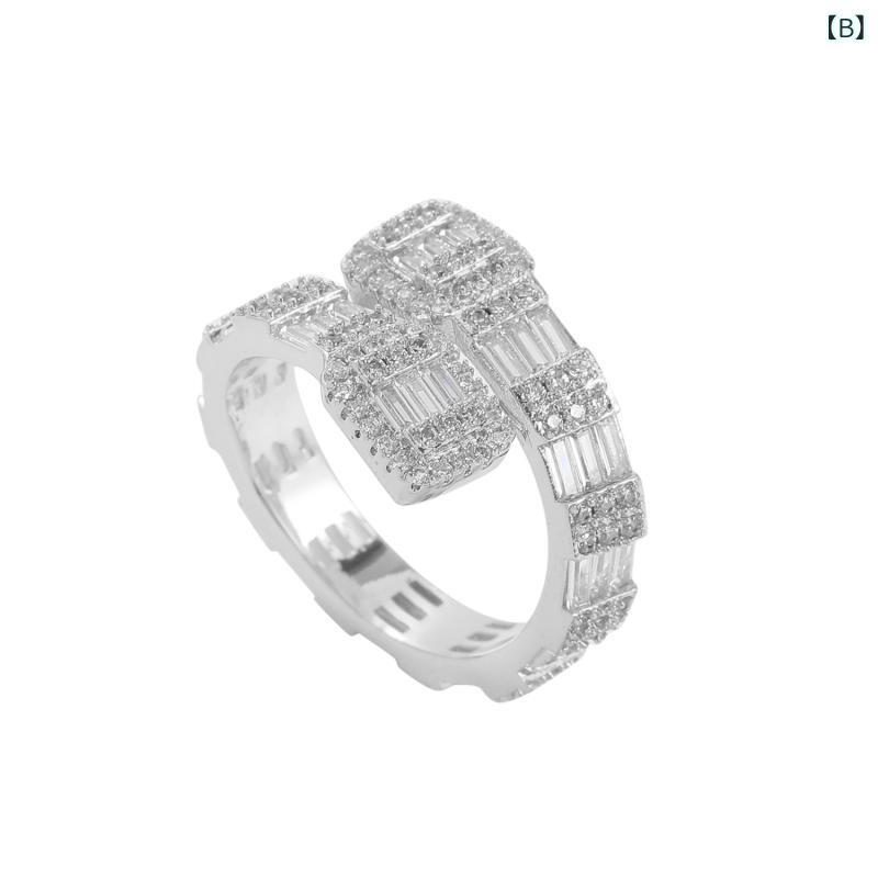 指輪 男女兼用 ヒップホップ ストリートスタイル 18K金 電気メッキ加工 銅製 マイクロパヴェ オープンリング スクエアカット ジルコニア 幾何学模様 ゴールド シルバーカラー ファッション アクセサリー