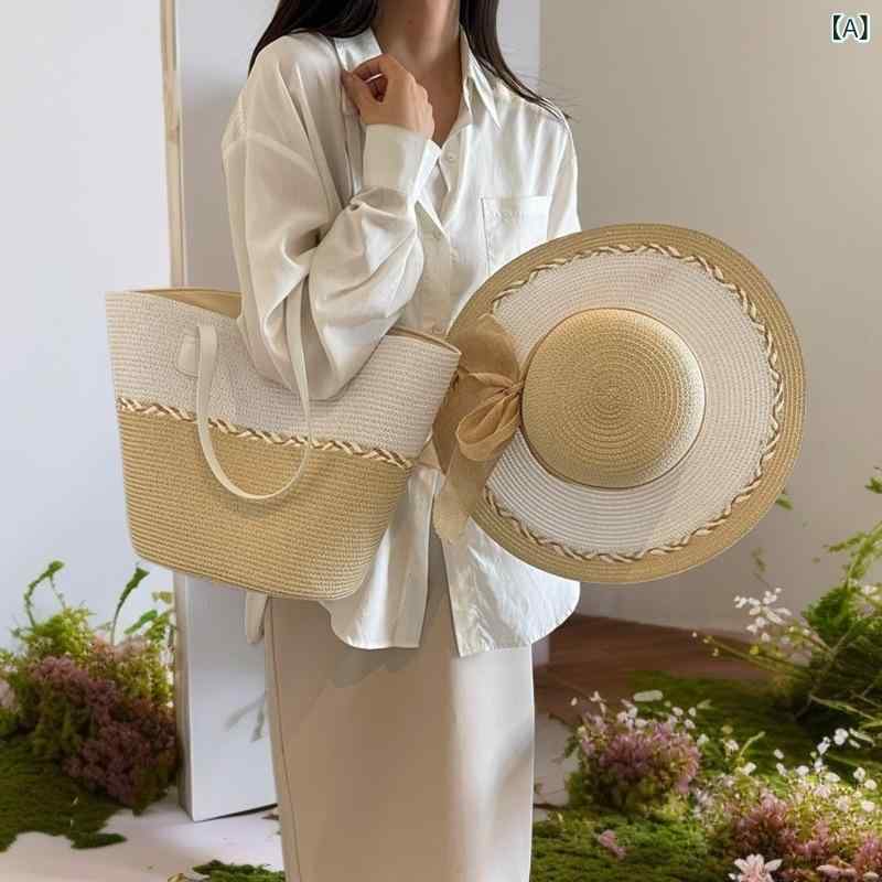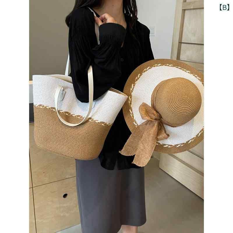 麦わら帽子 レディース かごバッグ セット 春夏 大容量 ビーチ リゾート 日よけ UVカット ストロー素材 編み込み バケツ型 おしゃれ バスケットバッグ 普段使い ファスナー付き 内ポケット付き つば広 お出かけ