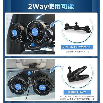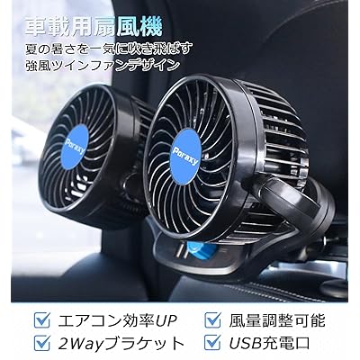 PORAXY 車用扇風機 車載電動ファン 後部座席用 多用途グリップ付き リアフロント 携帯など電子デバイス充電用2つUSBポート付き 12V 二段階風量調節/角度調整可能 ツーファン付き 汎用タイプ 軽型自動車 トランクまで対応可能 空気循環 夏対