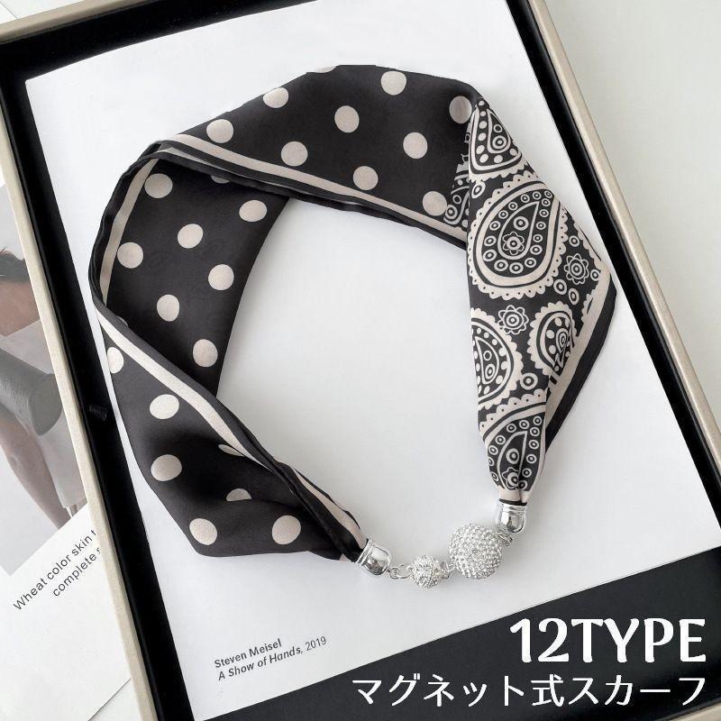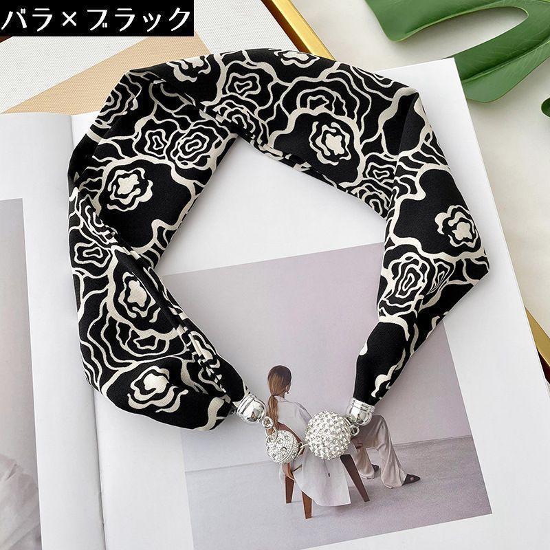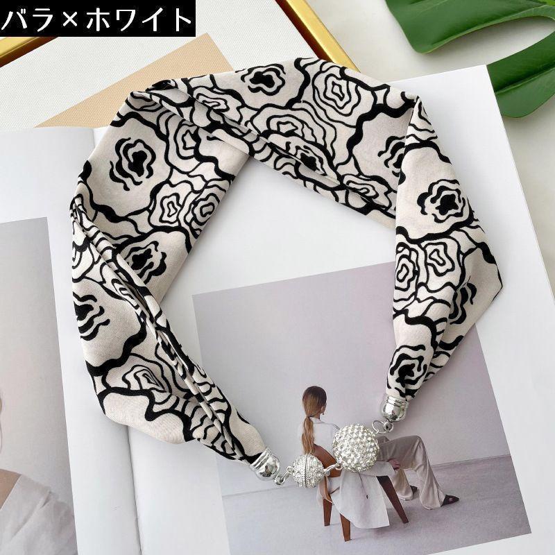 スカーフ マグネット式 レディース ワンタッチ 簡単 ネックレス風 ラインストーン プリント シルクタッチ エレガント きれいめ