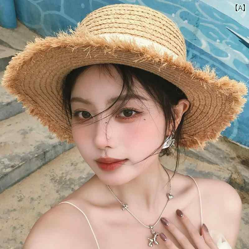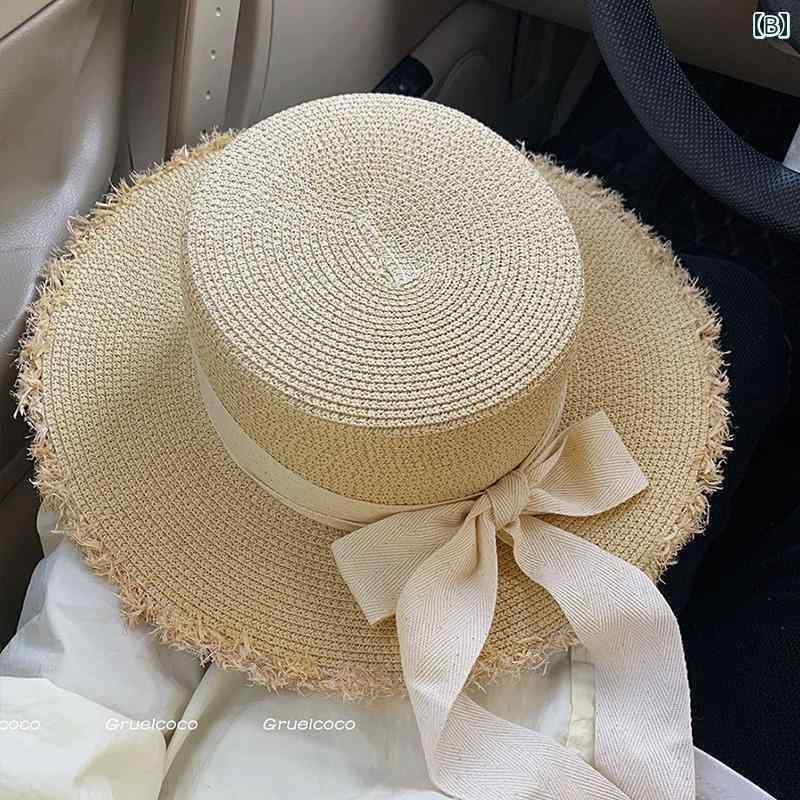 麦わら帽子 レディース むぎわら帽子 麦わら 帽子 海辺の フレンチ フラット トップハット 2025 夏の ビーチ サンシェード 海辺 三 亜 写真