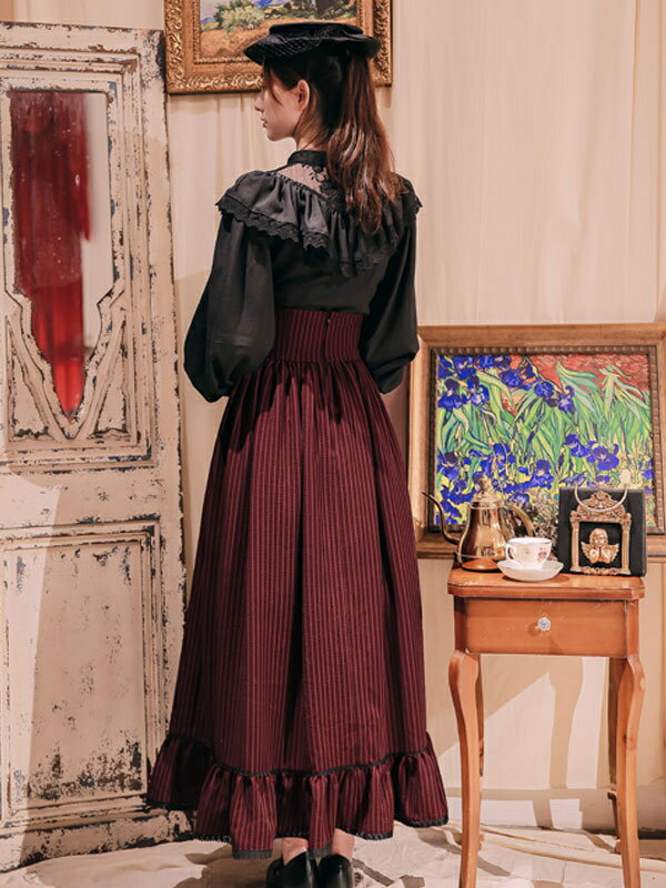 新入荷 pink クラシックロリータSKアルパインガールレースアップフリルストライプコットンリネンロリータスカート