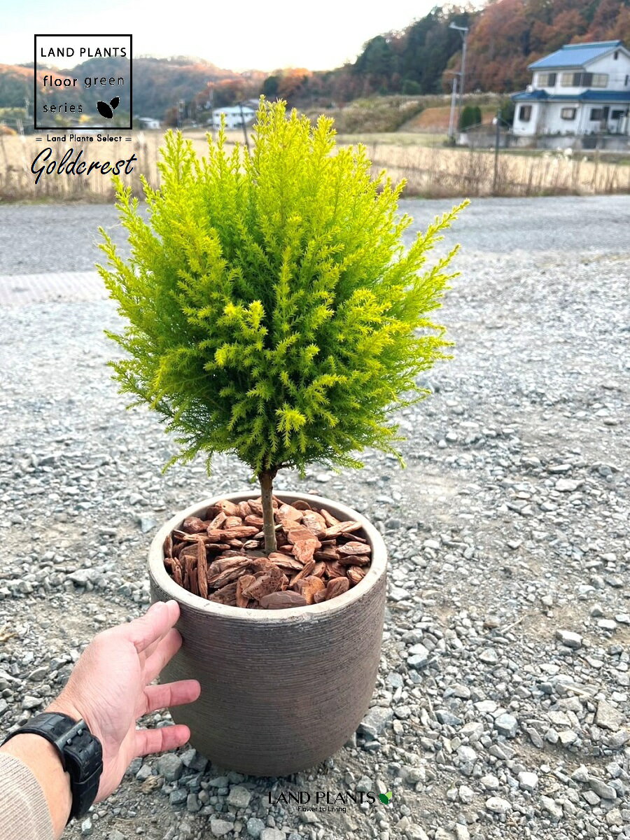 ゴールドクレスト(ボール型トピアリー仕立て) デザイン良い テラコッタ鉢 1鉢 【バークチップ】 ヒバ コニファー コニファ ヒノキ 針葉樹 conifer Hesperocyparis macrocarpa Goldcrest