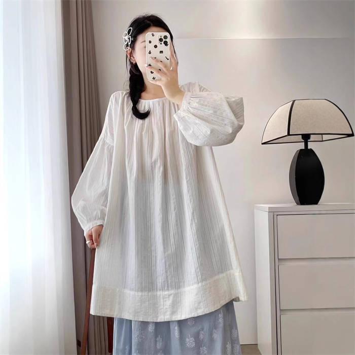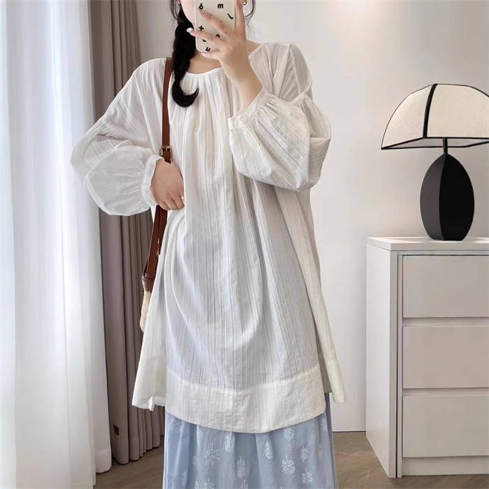 シャツ チュニック 綿 レディース 新作 ロングシャツ 長袖 無地 バルーン袖 プリーツ シャツチュニック ラウンドネック トップス プルオーバー コットン 春 夏 秋 デザイン感 ゆったり カジュアル シンプル ガーリー 通勤 通学 オフィス 体型カバー 切り替え 送料無料
