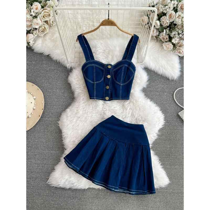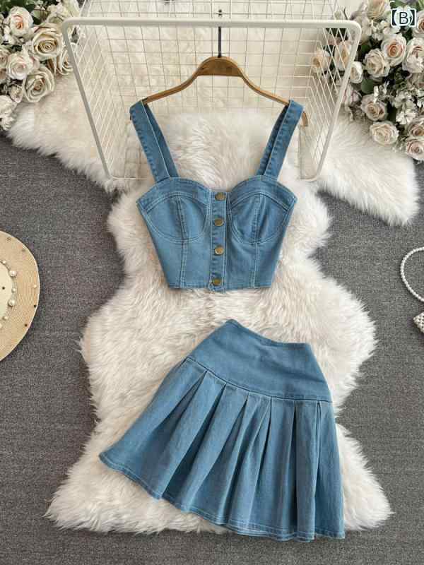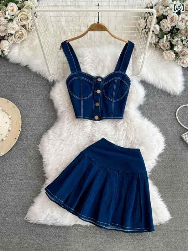 セットアップ レディース カジュアル アメリカンレトロ デニムビスチェキャミソール ハイウエスト Aライン プリーツスカート ツーピース 着痩せ ポリエステル ダークブルー ライトブルー