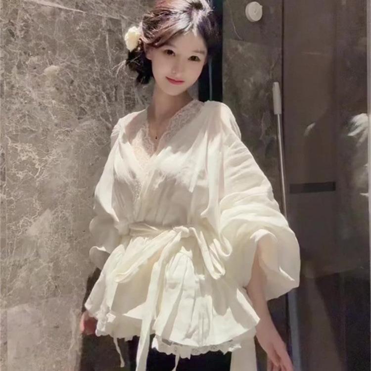 シャツ レディース フレンチレースフリル 長袖 Vネック ホワイト 高級感 デザイン性 上品 ショート丈 ウエストマーク スリムフィット オフィス カジュアル ブラウス