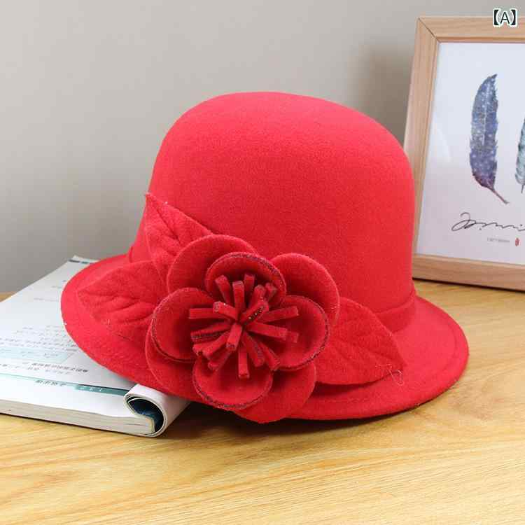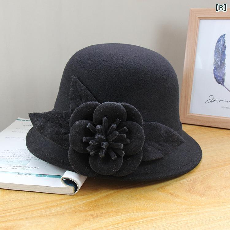 フェルトハット レディース 女性用 ラウンドトップ レトロ ミニハット エレガント 上品 ブリティッシュ 韓国風 無地 花装飾 ウール素材 秋冬 サイズ調整可能 万能 ファッション 小物