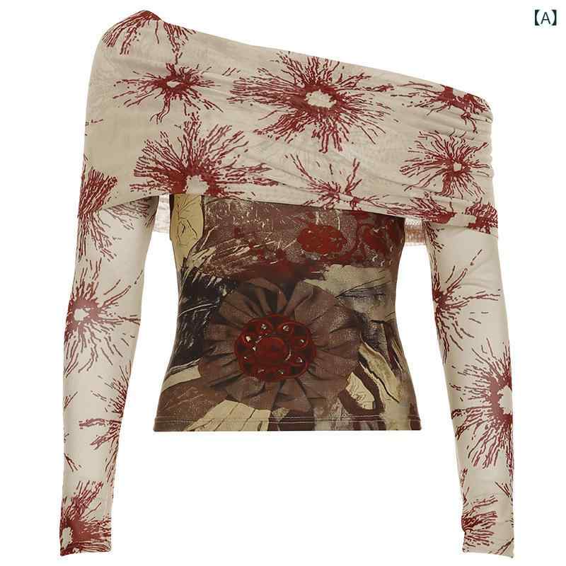 Tシャツ レディース レトロ ヴィンテージ風風 古着風 個性的 プリント柄 バイカラー メッシュ シアー 切り替え オフショルダー 襟付き スリムフィット 長袖 トップス ポリエステル 再生繊維 秋冬