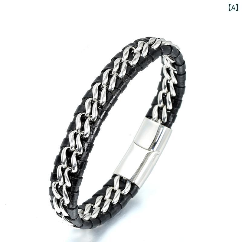 ブレスレット メンズ 男女兼用 アクセサリー ジュエリー チタン鋼 本革 レザー ダブルチェーン 編み込み シンプル ヒップホップ ジオメトリック 欧米風 ファッション 通勤 カジュアル 普段使い ギフト プレゼント