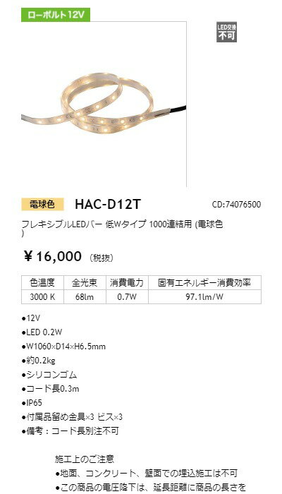 タカショー フレキシブルLEDバー 12V 低Wタイプ 1000mm 連結用 光源色:電球色 トランス・アクセサリ別売 コード:74076500 HAC-D12T