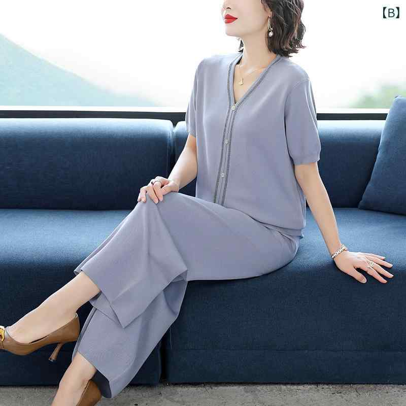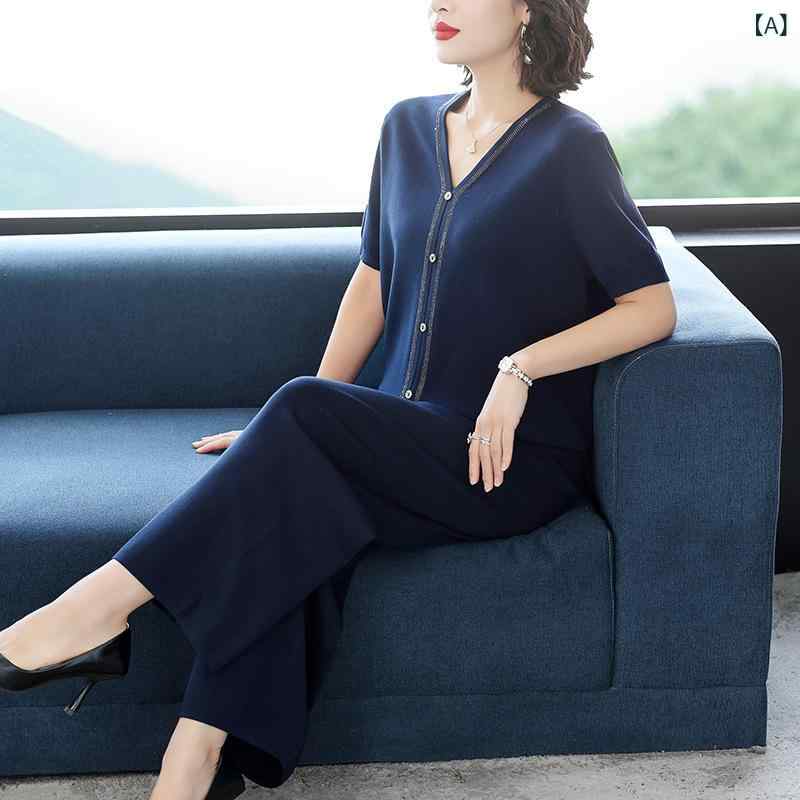セットアップ レディース ミセス カジュアル ファッション 夏 半袖 ゆったり ルーズフィット 接触冷感 ポリエステル 通勤 普段使い ツーピース ネイビー グレー レッド