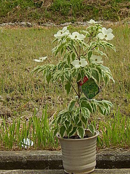 ヤマボウシ鉢植え斑入りはウルフアイ 花に...