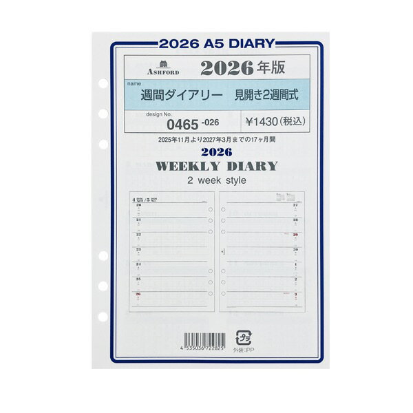 2026年度 ASHFORD A5 ダイアリー リフィル 0465-026 ...