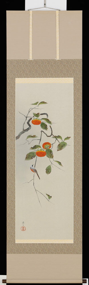 掛け軸 柿に小鳥/高見蘭石 尺五 掛軸 ...