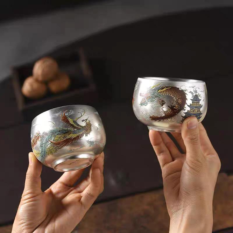 茶器 純銀製 999 銀彩 金糸 龍鳳文様 湯呑 お...