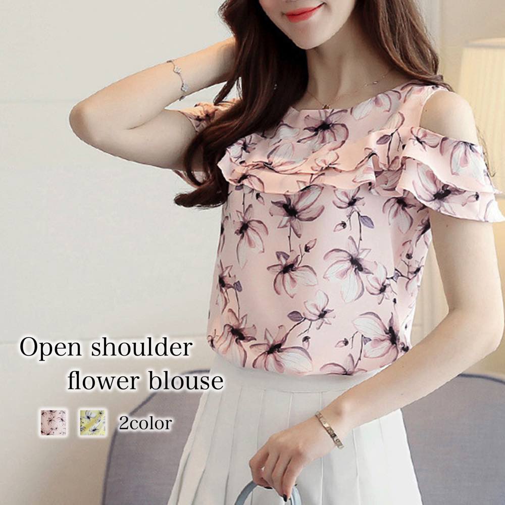 Tシャツ レディース 肩開き花柄ブラウス テ...