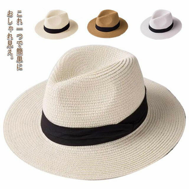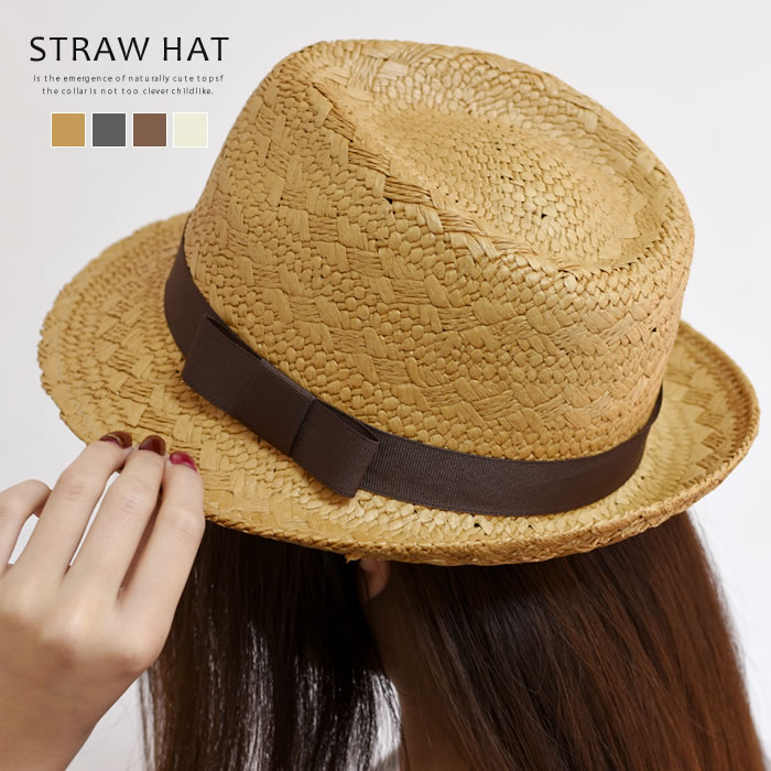 天然 麦わら帽子 中折れリボン付き ストロー...