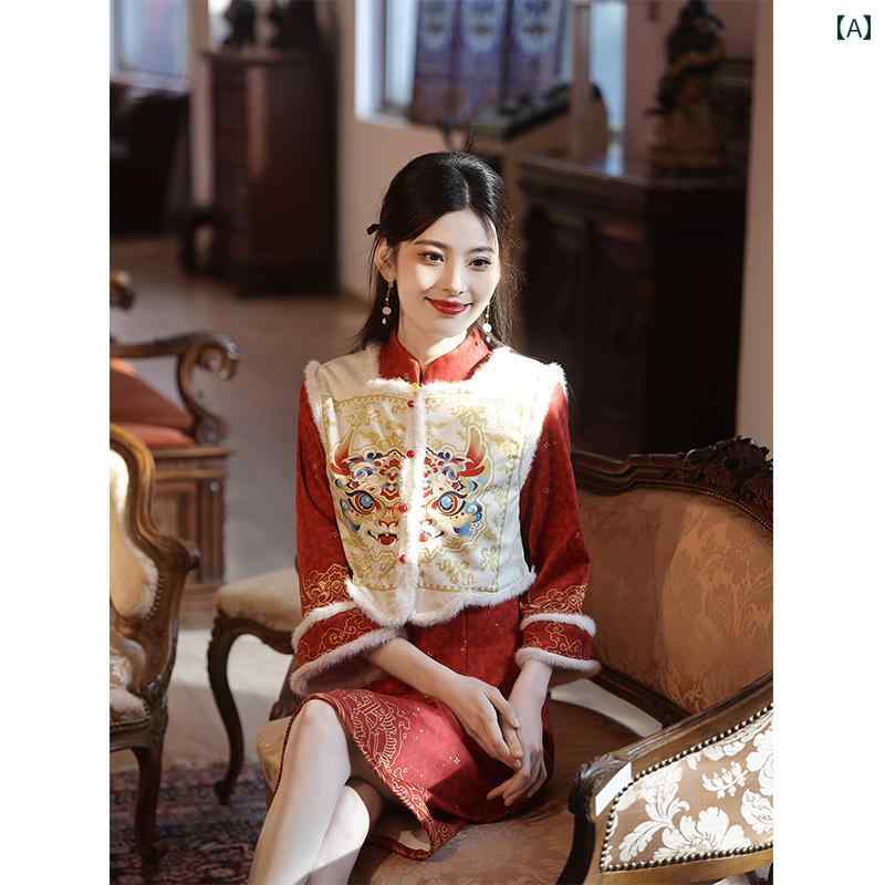 レディース 赤い チャイナ ドレス 冬 長袖 裏...