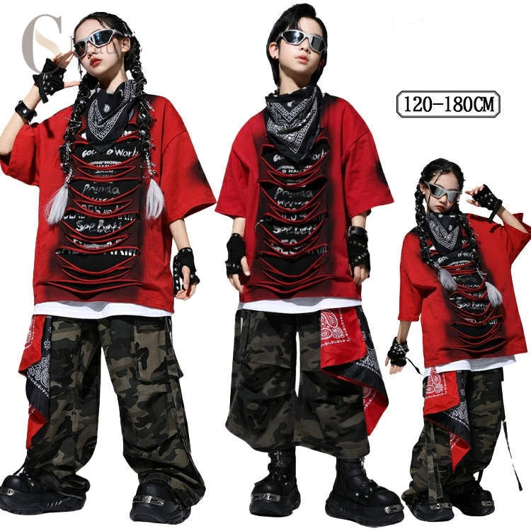 迷彩柄 HIPHOP 舞台服 穴あきデザイン 赤 Tシャ...