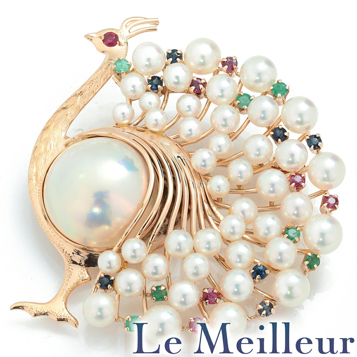孔雀モチーフブローチ 真珠 ルビー K14 【最...