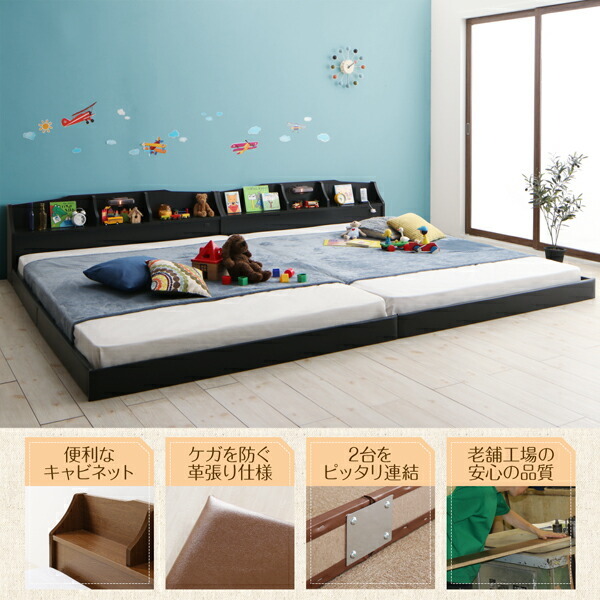 親子で寝られる収納棚・照明付き連結ベッド 国産ボンネルコイルマットレス付き クイーン(SS×2)
