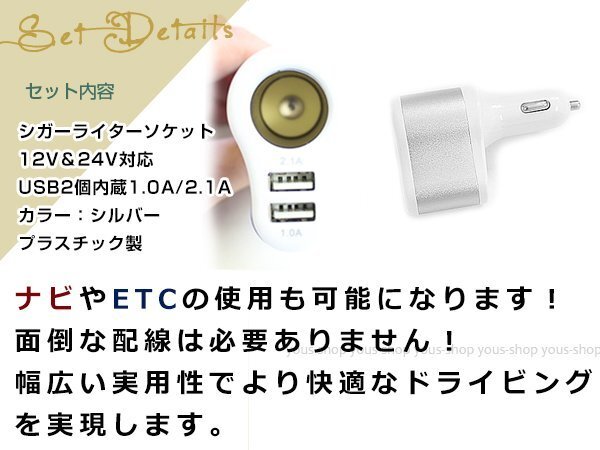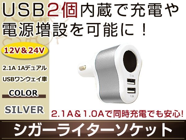 シガーライターソケット シルバー 2.1A 1A デュアルUSBワンウェイ車 12V/24V対応 USB2個内蔵 2台同時に充電可能 スマホ タブレットの充電に