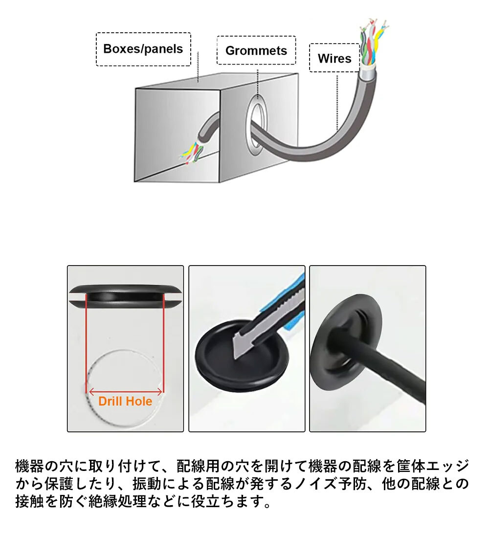 【7種170点セット】ゴムブッシング ケーブル 保護 耐衝撃 耐振動 絶縁 ブラック