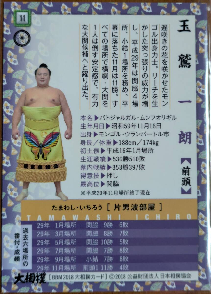 2018BBM 大相撲カード 玉鷲一朗(前頭) レギュラーカード