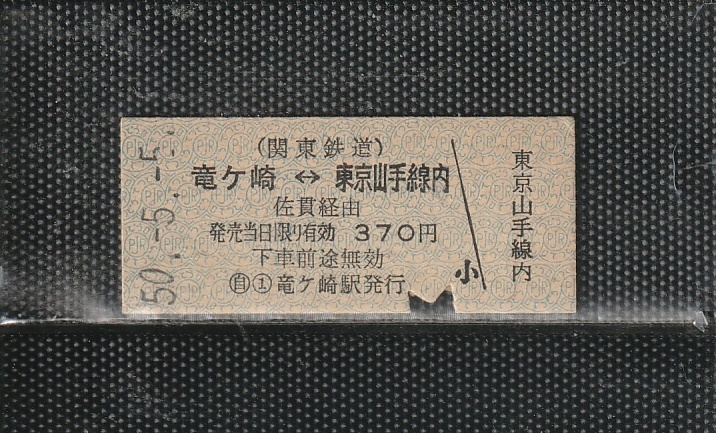 関東鉄道 竜ケ崎から東京山手線内 B型 青地紋 連絡 硬券乗車券 下パンチ券