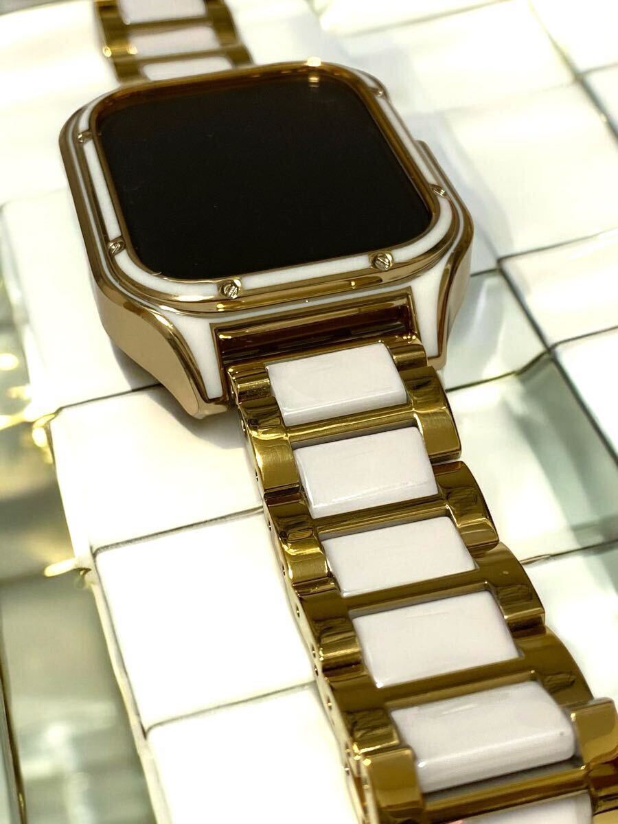 アップルウォッチ 40 41 44 45 ステンレス&セラミックベルト Apple Watchカバー ケース 画面保護付きカバー ゴールドホワイト